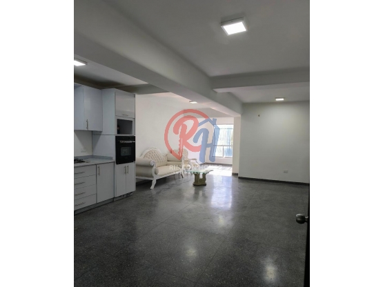 Cocina en tope de granito, estufa, horno, nevera, sala, comedor